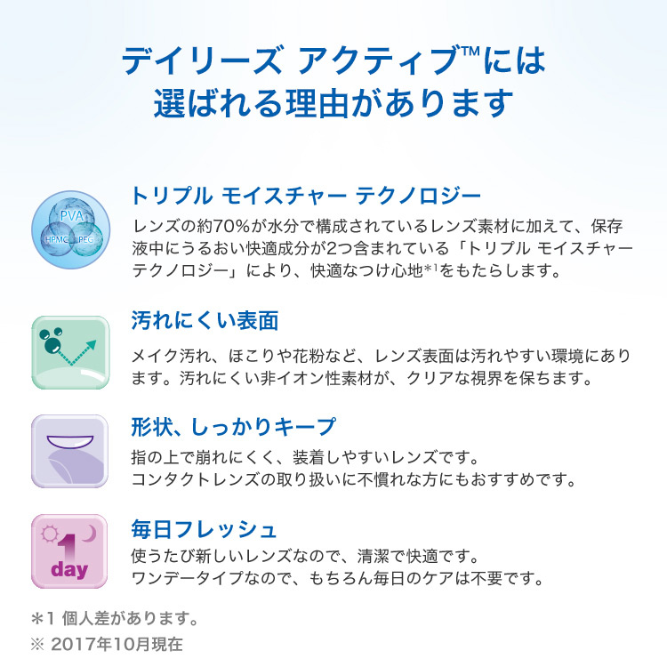 「デイリーズアクア」と同じレンズ素材(PVA)の保水効果に加え、レンズの保存液中に 新うるおい成分(HPMC・PEG)を配合。 新うるおい成分が時間の経過とともに2段階にわたって作用し、さらにレンズ素材がうるおいを保持するので、つけた時から1日の終わりまで快適性を保ちます。 また、含水率の高いコンタクトレンズは、つけた瞬間うるおいを感じます。非イオン性であるためレンズにたんぱく質がつきにくく清潔です。 一日使い捨てだから花粉の季節にもぴったりなコンタクトレンズです。
