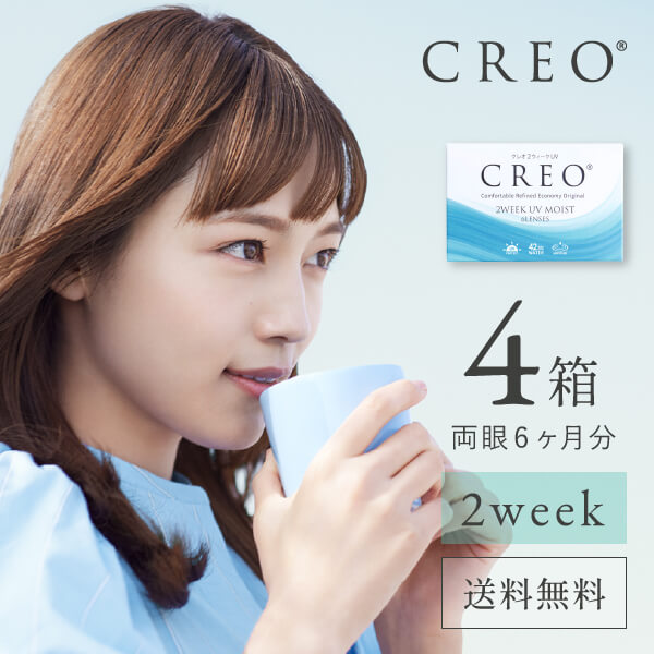 クレオで見よう。2ウィークUVモイスト 自然体コンタクト CREO ポスト投函で受け取りがラクラク たっぷりうるおって気持ちいい瞳へ。 保湿成分配合で、ずっと、うるおい続く 非球面レンズ採用で視界はっきり