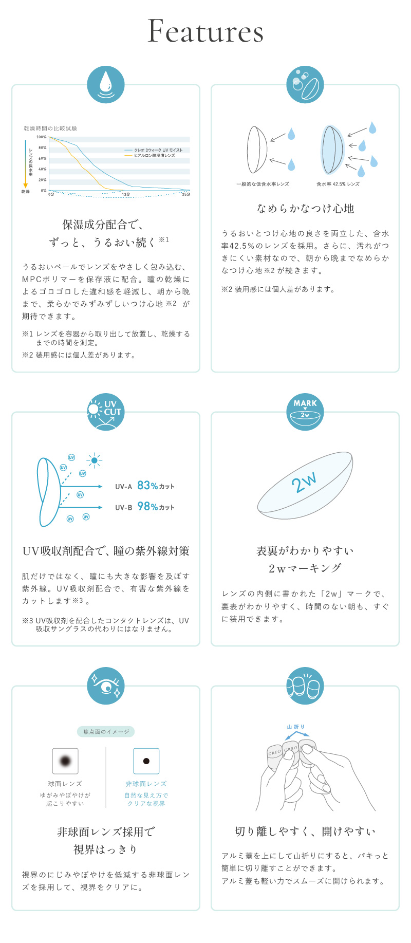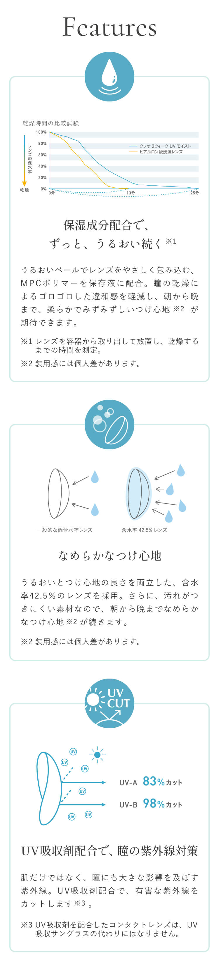 クレオで見よう。2ウィークUVモイスト 自然体コンタクト CREO ポスト投函で受け取りがラクラク たっぷりうるおって気持ちいい瞳へ。 保湿成分配合で、ずっと、うるおい続く なめらかな、つけ心地 UVカット素材で瞳の紫外線対策 裏表がわかりやすい2wマーキング 非球面レンズ採用で視界はっきり 切り離しやすく開けやすい