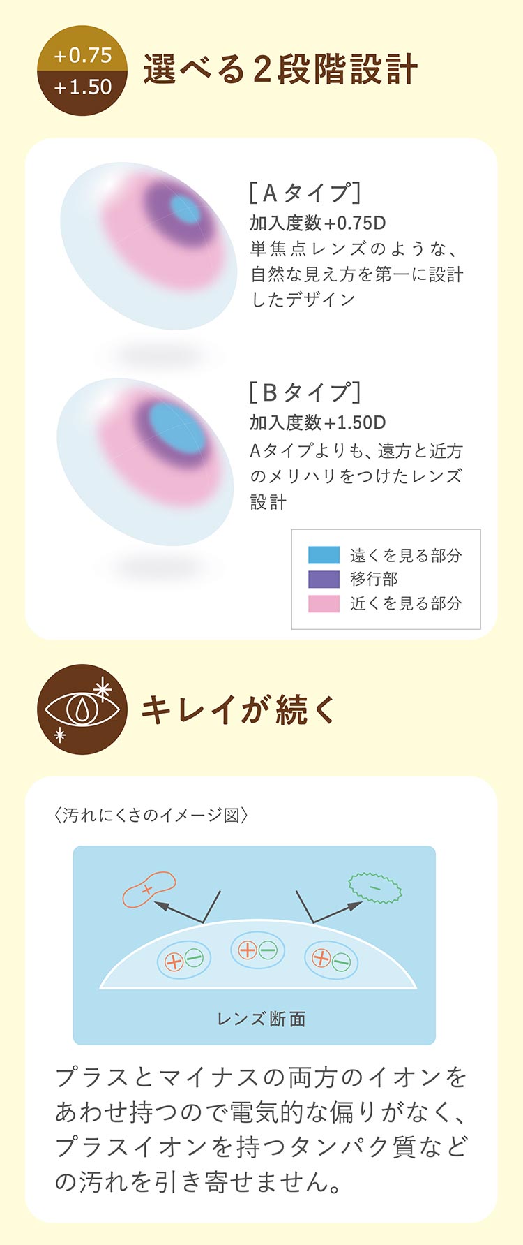 自然な見え方と快適な装用感を実現した遠近両用2週間交換コンタクトレンズ。 独自のレンズ素材「S I B 」で、汚れを寄せつけず、レンズ表面の水分をしっかり保持します。低加入度設計を採用し、見え方のクオリティ低下を抑えたプレミアム・コンタクトレンズです。